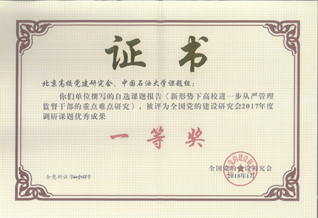 6月25日,北京高校党建研究会成立30周年纪念大会暨北京高校党建工作论坛在清华大学召开。会上宣读了全国党的建设研究会《关于表彰全国党建研究会2017年度调研课题优秀成果的决定》(全党研文〔2018〕1号),中国石油大学研究成果《新形势下高校进一步从严管理监督干部的重点难点研究》获得一等奖。