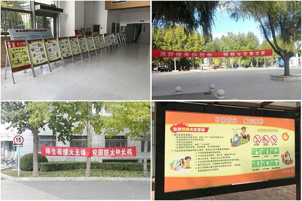 此外,保卫处、后勤管理处还通过在校园及学生公寓悬挂消防宣传横幅、展出消防知识展板、张贴橱窗宣传海报、微信图文推送消防安全知识等方式,营造校园消防安全氛围。