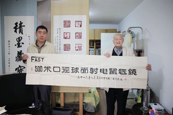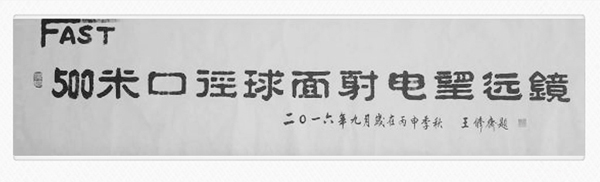 对于此次应邀为FAST工程题名,王修斋教授倍感自豪,他说:“FAST工程独一无二,其落成启用振奋人心,将为国家科技创新做出重要贡献,能够为其题名,我感觉很光荣!”王修斋1961年毕业于北京石油学院力学师资专业,后一直任教于中国石油大学至退休。他自幼酷爱书法、篆刻,教书育人的同时,几十年临池不辍,他的书法和篆刻作品在国内外书画大赛中多次获奖,其万字微雕作品《中华人民共和国宪法》被全国人大图书馆收藏,红砖篆刻作品《纪念中国人民抗日战争胜利六十周年》被中国人民抗日战争纪念馆收藏。