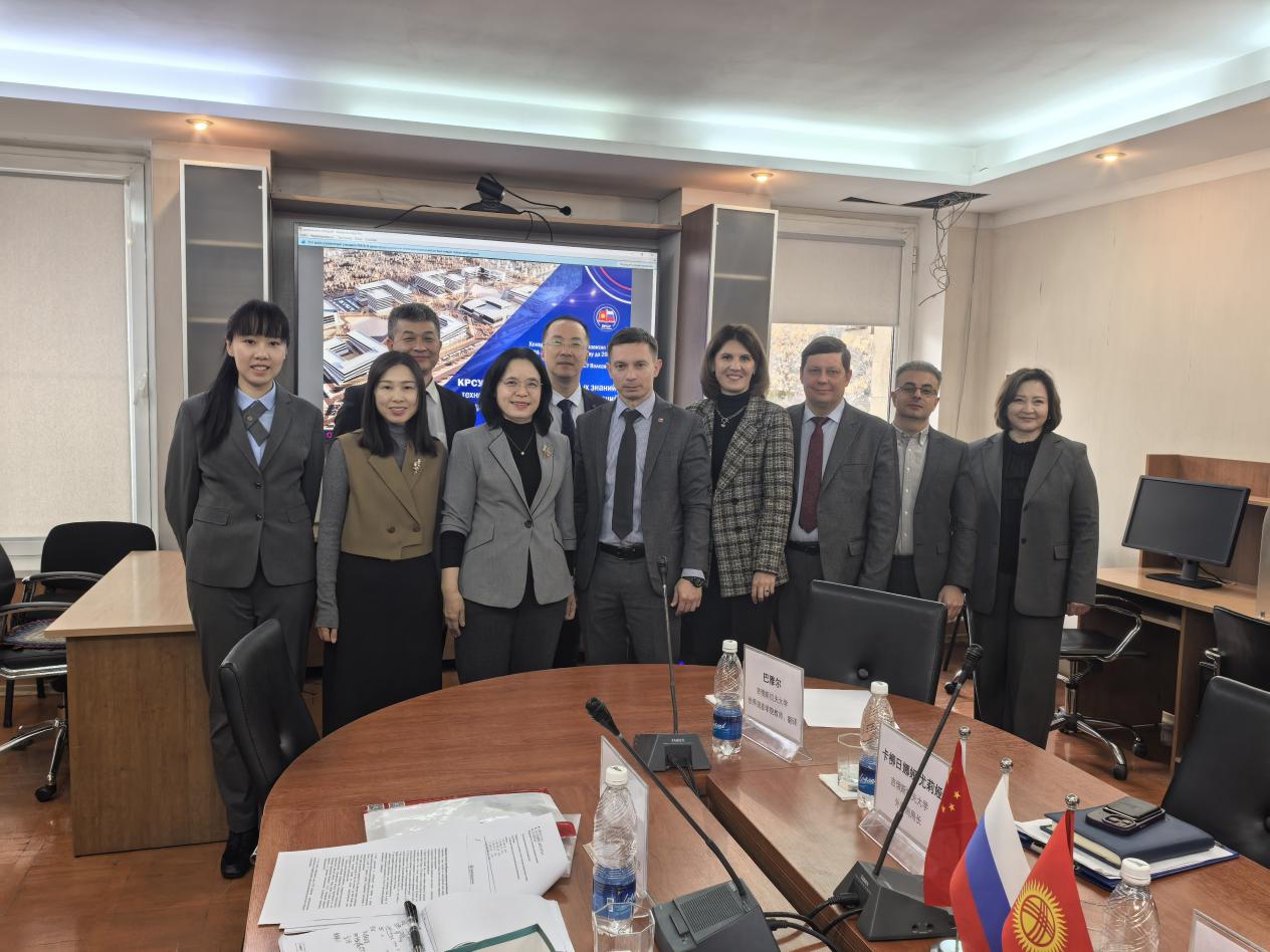 12月10日,代表团一行访问了吉尔吉斯斯坦与俄罗斯联邦政府共建的吉尔吉斯-俄罗斯斯拉夫大学。该校校长谢尔盖•尤里耶维奇(Sergei Yuryevich),副校长伊琳娜•瓦西里耶夫娜(Irina Vasilyevna),副校长伊万·亚历山大(Ivan Alexander),国际合作处、世界语言学院、工程学院主要负责人参加座谈。会上,双方分别介绍了学校基本办学情况和发展规划,并就合作项目推进落实进行深入探讨。双方达成共识,两校在石油天然气、俄语、中文、机械等专业领域有合作共同点,将尽快制定实施细则,推进开展暑期实习、夏令营、双学位项目等实质合作。访问期间,代表团参观了斯拉夫大学博物馆和由中亚秦商会在该校开设的中国文化语言中心。