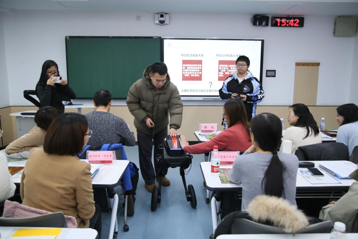 在“典籍视界”环节,师生共同观看了中央广播电视总台《典籍里的中国》节目《周易》的经典片段。在“古籍新解”环节,机械与储运工程学院副教授王吉、图书馆副研究馆员尹成芳分别以“《周易》当中的自然哲学——蚁群算法介绍”“打开《周易》的图书馆之道”为题,探讨了《周易》中“变易”“系统”思想与群体智能算法的内在关联,演示了如何构建“《周易》哲学—能源战略”的研究框架。在“古今对话”环节,机械与储运工程学院能源与动力工程专业2022级本科生杨璞、2023级本科生李向民对比了古代顺应自然与现代主动创新的能源利用思维。在“科技随想”环节,机械与储运工程学院能源与动力工程专业2022级本科生吕福康以“《周易》智慧赋能节能减排创新实践”为题,现场展示了他荣获第十八届全国大学生节能减排社会实践与科技竞赛特等奖的作品,解读如何将“洞察先机、动态平衡”的思想融入技术设计。机械与储运工程学院机械工程专业2024级硕士研究生侯润彤以“古智今用,和合共生——《周易》思想在机器人与智能装备的跨学科探索”为题,介绍了在人形机器人运动调控中融入“阴阳平衡”“动态调和”理念的研究探索,并现场进行了机器人行走演示。在“古技今用”环节,师生共同体验了“锡纸浮雕画”手工制作,运用阴刻、阳刻创作手法,在动手实践中直观感受“阴阳相济”的视觉表达与工艺智慧。在“薪火相传”环节,师生摘抄了《周易》中“天行健,君子以自强不息”“地势坤,君子以厚德载物”等经典语句。