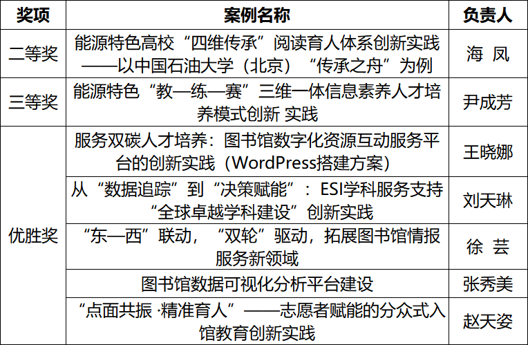 案例“能源特色高校‘四维传承’阅读育人体系创新实践——以中国石油大学(北京)‘传承之舟’为例”获二等奖,该案例立足学校能源报国精神文脉与石油文化底蕴,构建起“精神传承、文化传承、知识传承、爱心传承”四维联动的阅读育人体系,体现了图书馆在文化传承创新与时代新人培养方面的独特价值;案例“能源特色‘教—练—赛’三维一体信息素养人才培养模式创新实践”获三等奖,该案例以终身学习能力培养为目标,构建了‘教—练—赛’三维一体信息素养培养模式,形成“学以致用—学而习之—学有所成”的闭环。此外,在数字化资源互动平台建设、学科知识服务、情报服务、数据可视化分析平台建设、入馆教育等领域的5个实践案例获得优胜奖,彰显了图书馆服务创新工作的系统性与覆盖面。
