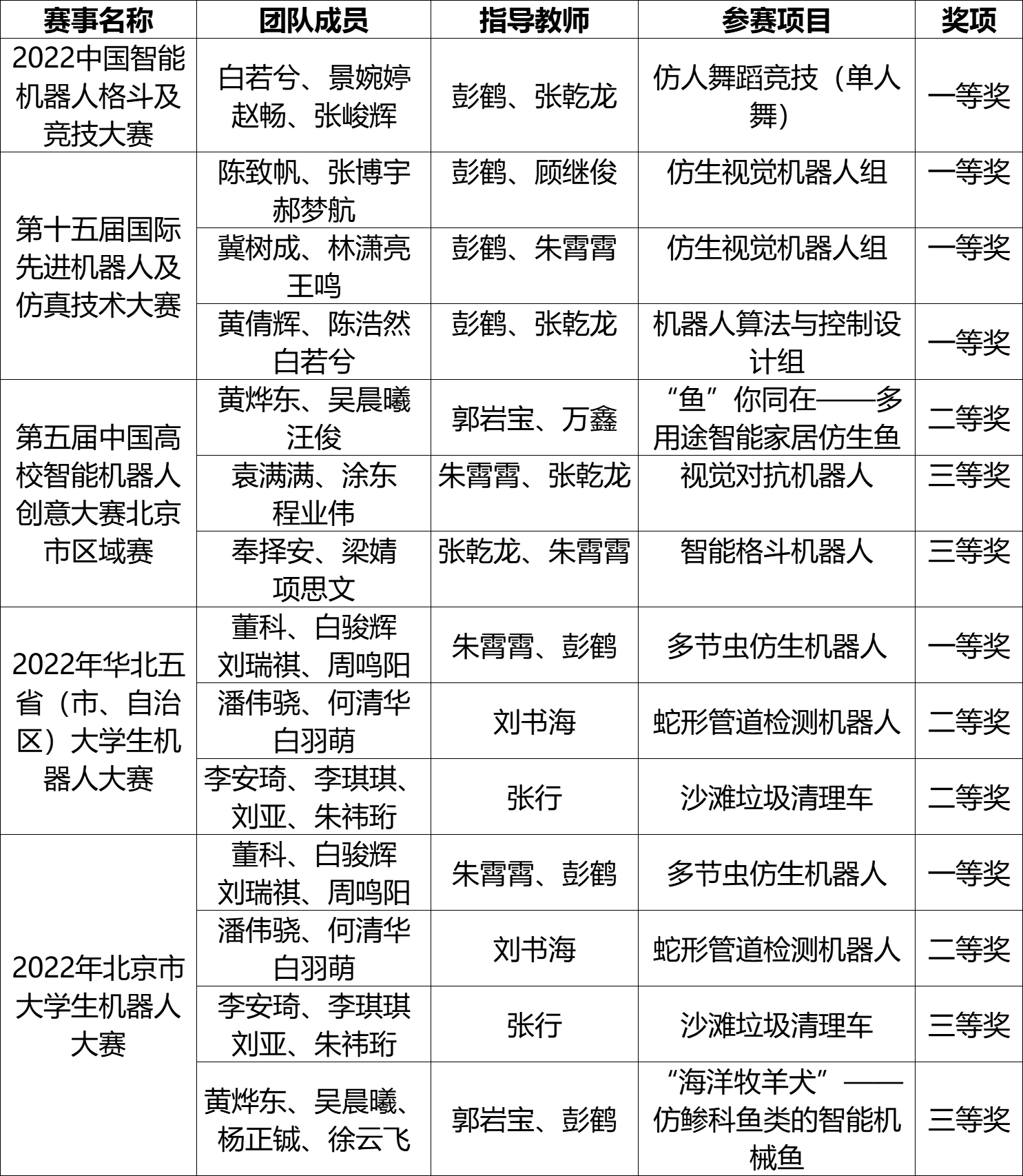 学校机械与储运工程学院本科生白若兮、景婉婷、赵畅、张峻辉在中国智能机器人格斗及竞技大赛仿人舞蹈竞技(单人舞)项目中获得一等奖,该竞赛已纳入2022全国普通高校机器人竞赛指数。此外,学校获第十五届国际先进机器人及仿真技术大赛一等奖3项,获第五届中国高校智能机器人创意大赛北京市区域赛二等奖1项、三等奖2项,获2022年华北五省(市、自治区)大学生机器人大赛一等奖1项、二等奖2项,获2022年北京市大学生机器人大赛一等奖1项、二等奖1项、三等奖2项。朱霄霄、彭鹤皆获评华北五省(市、自治区)大学生机器人大赛优秀指导教师和北京市大学生机器人大赛优秀指导教师。