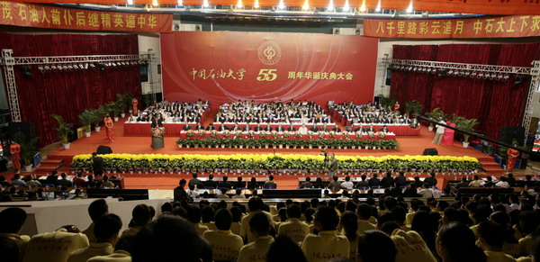 金秋时节硕果累累,校园盛装喜迎来宾。在全校师生及各界校友的关注和期待中,中国石油大学迎来了建校55周年的喜庆时刻。10月4日上午9:00,纪念建校55周年庆典大会在多功能厅隆重举行。