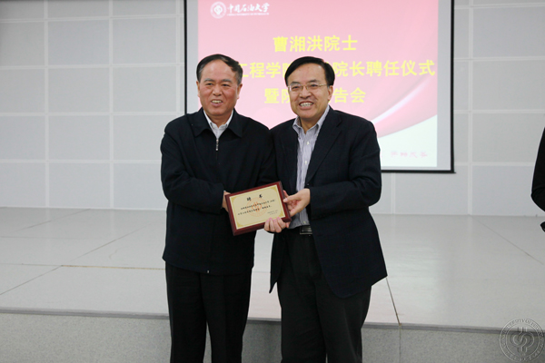 3月22日上午,中国石油大学化学工程学院名誉院长聘任仪式暨曹湘洪院士报告会在学生活动中心410报告厅举行。校长张来斌为中国工程院院士、美国国家工程院外籍院士曹湘洪颁发化学工程学院名誉院长聘书并致辞。