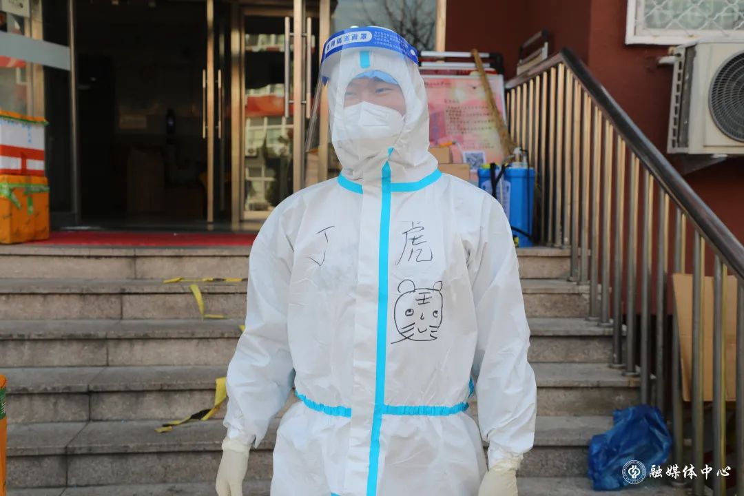 体育与人文艺术学院的丁虎老师在自己的防护服上画上了一只可爱的小老虎。他的确也是生龙活虎、虎气十足,几十斤重的箱子一个人直接拎起,真的是虎虎生威。“心里着急呀,就想着赶紧把东西送到同学们手中”。