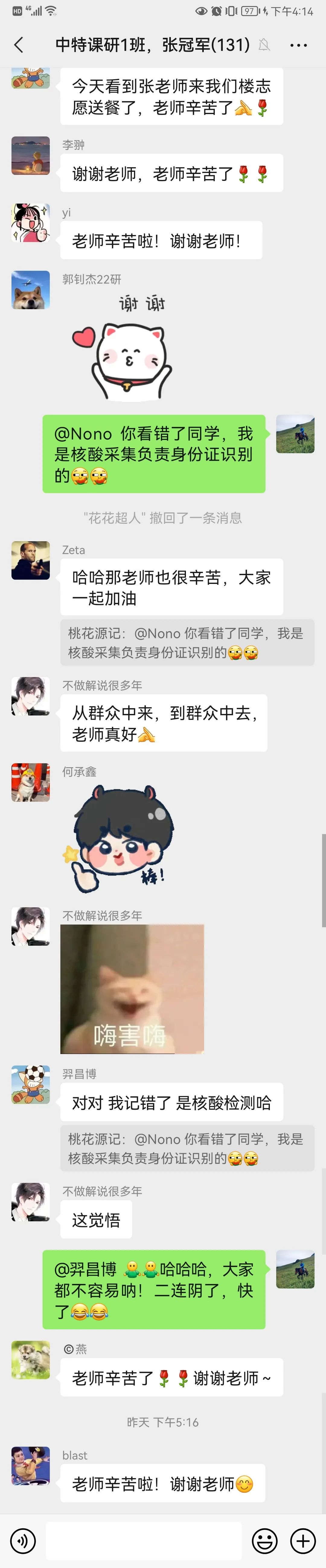 下午三点钟吃完午饭,张冠军给家人报平安。妻子心疼地唠叨:“50多了,高血压,还这么拼命。”张冠军连忙找补:“人家穆桂英53岁还挂帅征西呢,谁说俺男儿家不如女郎啊?!”他说,核酸采样小组里好多老师都是克服了家里这样那样的困难来的,有的家里孩子还小需要照料,有的刚刚失去了亲人,也有像他一样的“50后”“老一代”,“大家都在这个被认为‘高危’的工作中恪尽职守,我也为有幸参与到这样一个群体里而欣慰”。同学们也把张老师化身“大白”的事,在群里广而告之,表达着“师生同在、甘苦与共”的喜悦和感动。