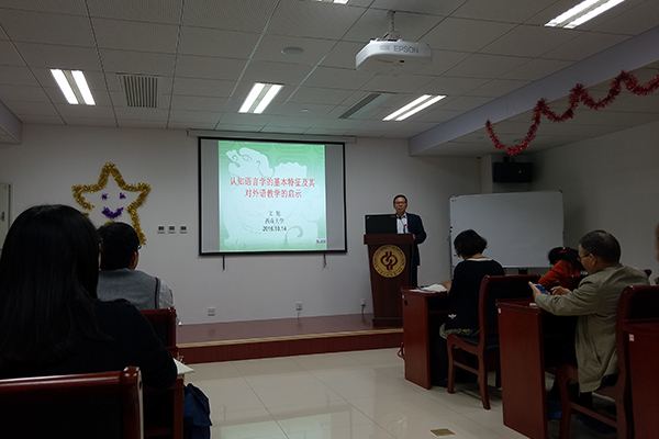 10月14日下午,西南大学外国语学院院长、博士生导师、教育部“新世纪优秀人才支持计划项目”获得者、教育部“优秀青年教师资助计划项目”获得者文旭受邀作了题为“认知语言学的基本特征及其对外语教学的启示”的学术讲座。讲座由学院院长赵秀凤主持。讲座中,文旭介绍了认知语言学在外语教学中的发展和应用前景,从认知语言学的五大重要特征出发,重点阐述了认知语言学作为外语教学基础的潜在有效性;并强调了“体验学习”以及知行合一的重要性。