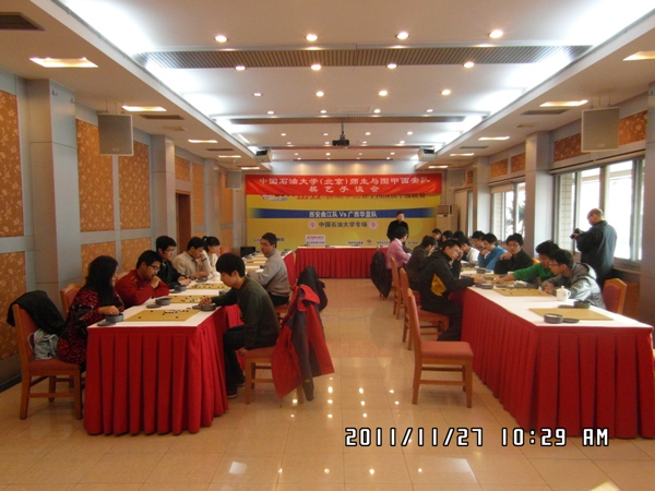 借围甲联赛在中国石油大学进行第20轮争夺战的机会,石大师生得以与围甲西安队进行棋艺切磋,丁伟,王昊洋,陶欣然等西安队主力出席了手谈会。石大14位同学与国手展开了激烈的对局,虽有让子,但同学们陆续败下阵来。本次手谈会同学们未能取得一盘胜利,但是同学们与国手建立了深厚的友谊,也对石大棋类运动的推广产生了积极作用。