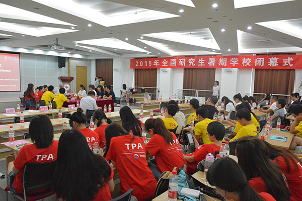 7月24日下午,2015年全国研究生暑期学校闭幕式在学生活动中心410报告厅举行。研究生院、石油工程学院、化学工程学院、外国语学院和中国能源战略研究院的教师代表,道达尔(中国)集团企业社会责任专员郭昱含、道达尔教授Jean-Michel Dumay等与暑期学校全体学员、志愿者一起参加了闭幕式暨学员结业典礼。