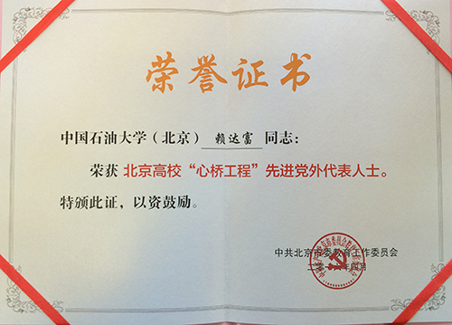 4月5日,北京高校统战工作会议在北京会议中心召开,会议对北京高校“心桥工程”优秀项目及先进党外代表人士进行了表彰。九三石大支社主委、理学院教授张万松负责的“创建高校科普基地、提高社会科学素质”项目获“心桥工程”优秀项目称号。致公党党员、人文艺术教育中心教师赖达富获“心桥工程”先进党外代表人士称号。