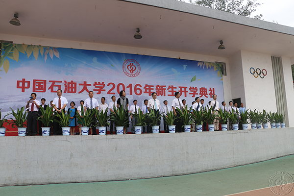 9月1日上午,中国石油大学在红旗操场举行2016年新生开学典礼,欢迎4000多名新同学的到来。校领导张来斌、刚文哲、雷玉江、吴小林、徐春明、庞雄奇,副校级干部鲍志东以及各学院和相关职能部门负责人出席了典礼。典礼由党委副书记雷玉江主持。
