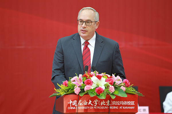 美国塔尔萨大学校长杰拉德·克兰西致辞说,中国石油大学与塔尔萨大学已有多年的合作历史,双方都在过去的合作中受益,克拉玛依校区的建设为双方提供了新的合作机会,希望今后塔尔萨大学能为中国石油大学的教学和科研发展出一份力,锦上添花。