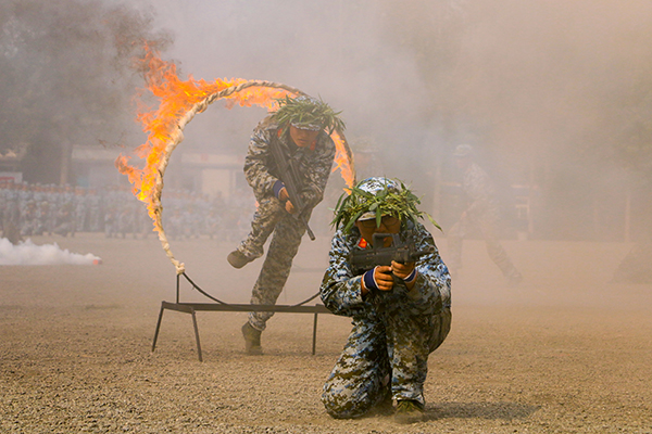 在分列式阅兵汇演中,辅导员方队与26支学生方队以嘹亮的口号和整齐的步伐昂首阔步地走过了主席台。军训成果汇报演出中,参训学生依次展示了队列表演、军体拳、匕首操、三声三相和战术演练等训练科目。