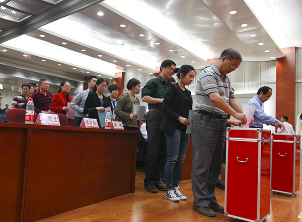 会议首先以举手表决的形式,通过了大会选举办法,第六届教代会常设主席团及各工作委员会委员、工会委员会委员、工会经费审查委员会委员、女教职工委员会委员候选人名单,以及总监票人、监票人、总计票人、计票人名单。最后,在总监票人周玉成的主持下,进行了大会选举。