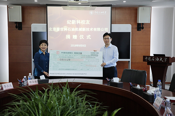 9月8日,中国石油大学(北京)举行捐赠仪式,石油工程系90级校友郑宗梅、炼制系91级校友纪新科分别向学校捐赠20万元、10万元资金,支持学校发展建设,为母校65周年华诞献礼。党委书记、北京中国石油大学教育基金会理事长山红红代表学校接受捐赠,党委副书记、副校长、北京中国石油大学教育基金会副理事长韩尚峰主持捐赠仪式,党政办公室、科学技术处、财务处、就业指导中心、学生工作处负责人参加捐赠仪式。