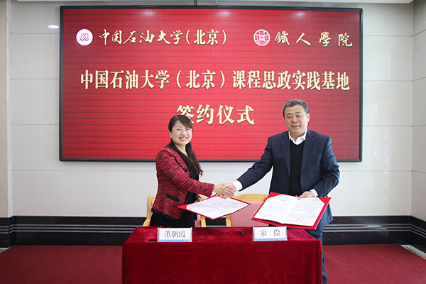 董朝霞与宋俭分别代表双方签署战略合作协议,并共同为“中国石油大学(北京)课程思政实践基地”揭牌。