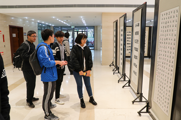 为深入学习宣传习近平新时代中国特色社会主义思想和党的十九大精神,展示中华优秀传统文化的博大精深,由石大党委宣传部举办的“执古之道 御今之有——王修斋教授习近平治国理政用典书法作品展”在主楼A座一层大厅“风华艺苑”开展。11月6日下午,党委书记山红红,相关职能部门负责人,院级单位党组织书记、副书记,学生代表等参观了展览。