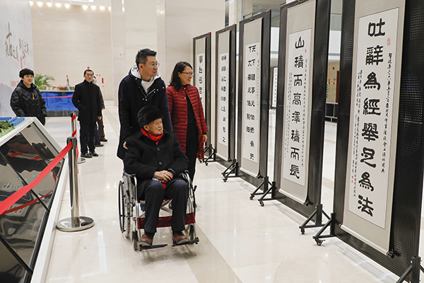 11月24日,王修斋教授携家人来石大观看作品展出情况,他表示,习近平总书记在重要讲话、文章、访谈中的用典,古为今用、推陈出新,旁征博引、画龙点睛,给人思想启迪和精神激荡,与习近平总书记治国理政思想桴鼓相应。本次创作的作品,展示了习近平总书记在敬民、为政、立德、修身、劝学、励志、倡廉等方面论述中引用的经典名句,希望通过中华优秀传统文化艺术形式,推进习近平新时代中国特色社会主义思想的学习宣传。