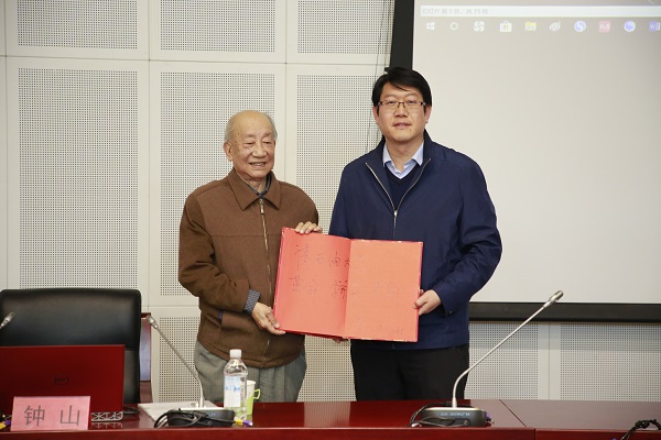 钟山院士介绍了钱学森突破重重阻碍回国报效的经历,体现的“艰苦奋斗、敢于创新、大力协同、无私奉献”航天精神,讲述了我国导弹工业从无到有,从弱到强,从研究到生产,从仿制到研制的跨越式发展,希望同学们能够传承发扬自力更生、艰苦奋斗的精神,为实现中华民族伟大复兴的中国梦而努力奋斗。讲座后,韩尚峰代表学校接受钟山院士的题字。