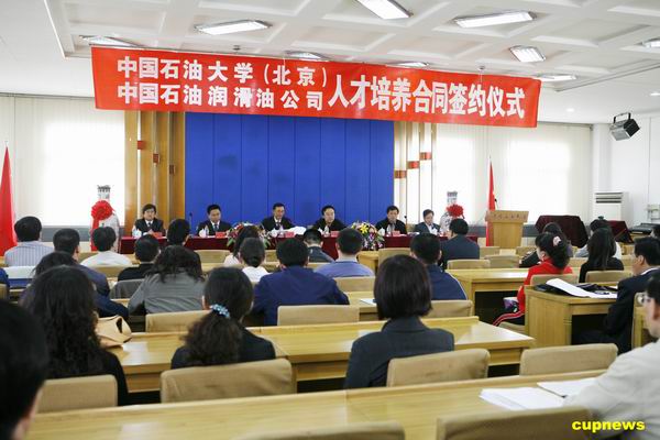 4月15日上午,中国石油大学(北京)与中国石油润滑油公司人才培养合同签约仪式暨开学典礼在第四会议室举行。中国石油润滑油公司党委书记梁国藩、人力资源处处长姜卫华,我校校长张来斌、研究生院副院长徐怀民、化工学院分党委书记郭绍辉、工商管理学院院长王震及润滑油班工业工程、项目管理及化学工程三个专业的近60名同学参加了典礼。