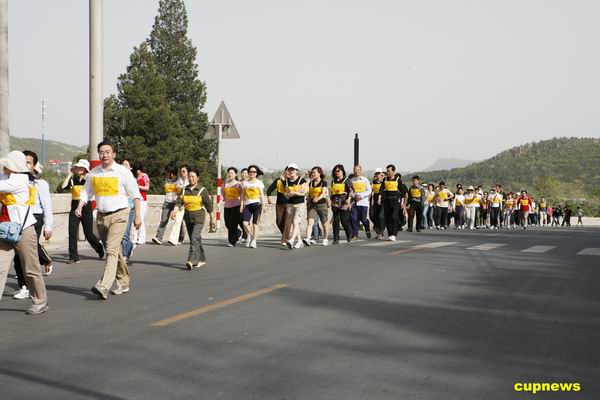 我校教职工“迎奥运倒计时100天”系列活动之一“迎奥运 健身行”长走活动于4月30日下午在风景秀丽的十三陵水库举行,由党委书记蒋庆哲发令出发,400多名教职工参加了此次活动。