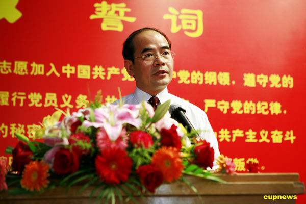 蒋书记强调,要牢记党的光辉历史,弘扬石大人的优良传统。他简要回顾了党的87年的光辉历程,并指出:没有共产党就没有新中国,没有共产党就没有中华民族的伟大复兴!多年来,学校同我们伟大的党一起,走过了光荣而曲折、坚实而豪迈的历程。每一次发展战略的确立,每一次历史性的跨越,每一次石大精神的升华,都铭刻着全体石大人团结一致、艰苦奋斗、开拓进取的足迹;都凝结着全体共产党员和广大教职员工的智慧、心血和汗水;都昭示着石大人虽饱经沧桑而石大精神不老,虽历经磨难而报国之志永存的激情与豪迈。