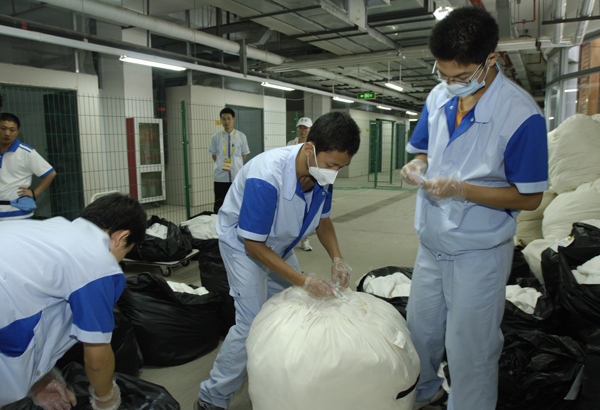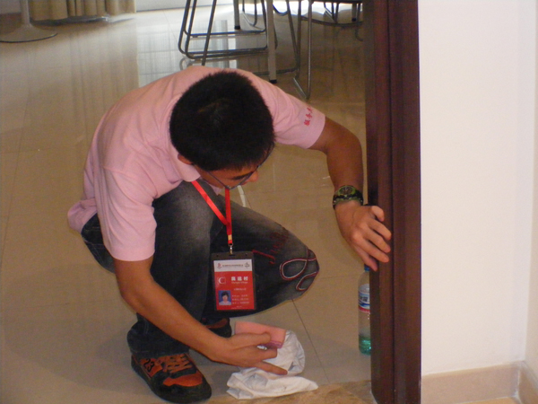 6月25日,我校奥运村(残奥村)住宿服务团队进驻北京市自动化工程学校,开始为期88天的奥运村住宿服务工作。从校园来到奥运村,从课堂步入社会,从学生转变为客房服务员,困难是来自多方面的:宿舍是由教室临时改建的,阴暗狭窄;浴室空间有限,男女生分时间段使用;与大学食堂相比,这里的菜品单一、菜价昂贵,很多同学都觉得吃不饱;从驻地到奥运村单程1.5公里,团队成员要在烈日下每日往返三次;发的工服质量差、不合身,鞋子磨破脚;三班倒的工作体制让学生“生物钟”紊乱,睡眠严重不足……虽说遇到了这些困难,但团队成员服务奥运的心是不会改变的。在经过两天的熟悉环境和适应性培训后,队员们就以高昂的热情、认真负责的态度,积极投入到了前期的“开荒”工作中。由于竣工不久的建筑卫生环境问题较多,使清洁的工作量极大,再加上没有专业的工具,使“开荒”工作难上加难。服务团队成员自制简易工具,甚至用手擦、用指甲抠,连班加点,硬是用一双双勤劳的手把1158间房间打扫得窗明几净、一尘不染。物资移入期间,由于物流车辆大部分夜间抵京,这就使得居服库房的44名团队成员必须昼夜坚守岗位,随时准备进入工作状态。几个不眠的夜晚,居服库房成员手手相传,将上万箱的物资移入了地下库房。