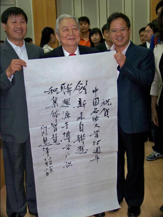 报告会结束后,闵院士题词“创新来自联想,联想来自博学广识和集体智慧”,并祝贺中国石油大学(北京)55周年华诞。