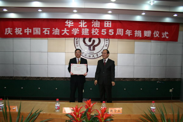 ,华北油田捐赠仪式在第三会议室隆重举行。党委书记蒋庆哲和华北油田副总经理赵贤正等出席了捐赠仪式。仪式由张士诚副校长主持。