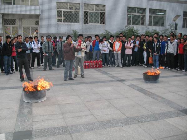 10月17日中午12点半,在三教楼前广场,由保卫处、学工处共同举办2008级新生消防灭火演练活动,大约200多名新生参加。保卫处有关同志给同学们讲解了在校应注意的一些安全防范知识,并就如何正确使用灭火器进行了演示。随后,部分同学使用灭火器进行灭火实战演练。