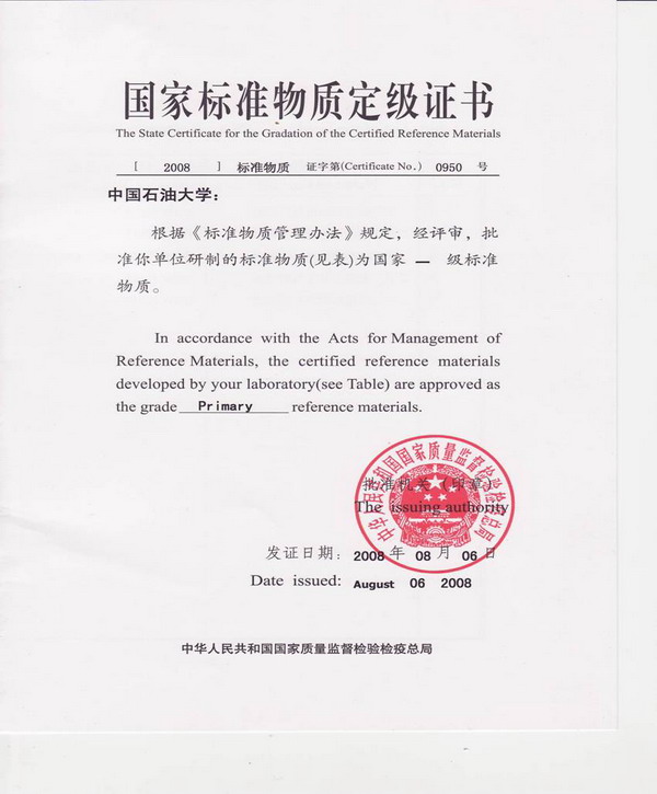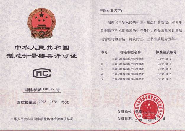 由我校重质油国家重点实验室陈胜利教授负责的973项目--纳米粒度标准物质的可控化学合成与量产(课题编号:2006CB932601)又取得重要进展,继2007年研制成功三种亚微米/纳米聚苯乙烯微球一级粒度标准物后,最近又成功研制了五种亚微米/微米二氧化硅微球国家粒度标准物质,并已被国家质量监督检验检疫总局正式批准为国家一级标准物质,列入中华人民共和国标准物质目录,颁发了“国家标准物质定级证书”和“中华人民共和国制造计量器具许可证”。此研究成果是在董鹏教授单分散微球长期研究的基础上取得的。