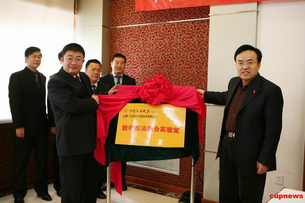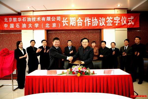 徐玉兵董事长和张来斌校长代表企校双方在合作协议上签字,并为联合实验室的成立揭牌。根据协议,本着友好合作、互惠互利、优势互补、共同发展的“双赢”原则,联合成立敦华石油联合实验室。敦化石油公司先期每年投入20万元人民币用于联合实验室的启动运行经费,并根据公司生产开发和科研工作的实际需要,校企双方共同开展科研攻关,敦华石油公司原则上每年累计投入联合实验室的经费不低于100万元人民币,用于各个科研项目的研发。