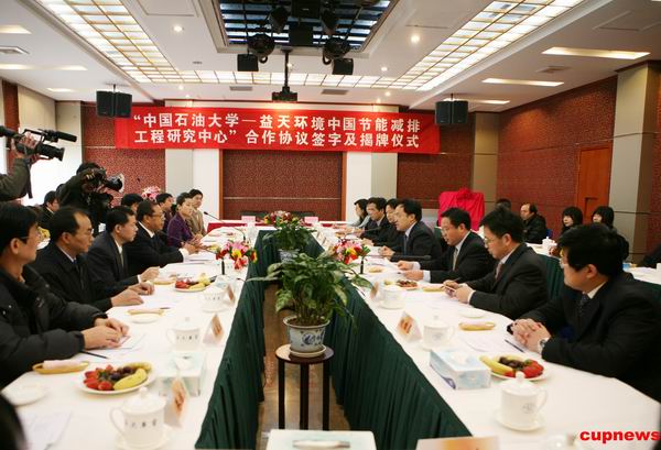 徐春明副校长与任庆春总裁代表校企双方签署“中国石油大学-益天环境中国节能减排工程研究中心”合作协议。根据协议,中心将围绕石油炼化、天然气等领域的节能减排新工艺新技术;硫化氢等尾气处理新工艺新技术;煤化工新工艺新技术;新工艺新技术相配套的新型反应器及其装备等4个研究方向开展研究。北京紫光益天环境工程技术有限公司支付人民币620万元运行经费用于中心的正常运转,运行经费将按年度分5次支付。