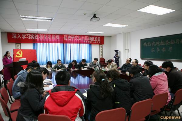 在机电工程学院,研07-4党支部第一小组全体党员在新科研楼521会议室开展了以“深入学习实践科学发展观,促进研究生全面和谐发展”为主题的组织生活。指导检查组听取了支部书记常茜同学所作的支部学习实践科学发展观活动开展情况汇报,观看了我校校史短片《厚积薄发开物成务––中国石油大学(北京)简介》。在主题讨论环节,支部党员结合个人实际情况,围绕“学习、科研、就业、实践与科学发展观”这一主题,阐述了各自对科学发展观的认识,讨论了如何运用科学发展观指导学习、科研、就业和实践。指导检查组王家勤同志作了总结讲话。他表扬支部的学习讨论活动组织得好,同学们的讨论将自身的学习、科研、社会实践以及就业工作等与科学发展观密切联系,主题很鲜明、研讨有深度,坚持了理论联系实际的学风。他强调指出,研究生是科学技术的生力军,要更加主动深入地学习实践科学发展观,促进自身全面和谐发展。他希望同学们更加努力,展现出中国石油大学“实事求是、艰苦奋斗”的校风,为祖国建设尤其是能源工业的发展作出积极贡献。