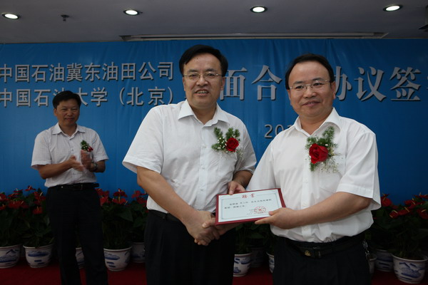 签字仪式上,冀东油田公司总经理苟三权受聘石油大学兼职教授,校长张来斌颁发了聘书。