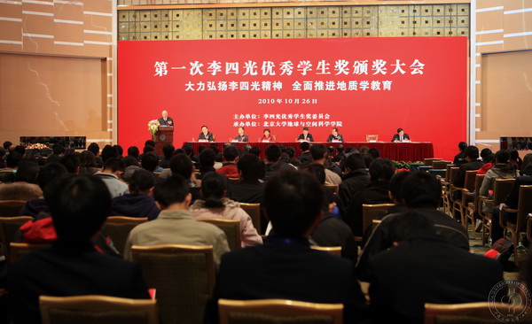 为大力弘扬李四光精神,全面推进地质学教育,10月26日,在李四光先生诞辰121周年之际,李四光优秀学生奖委员会在北京大学隆重举行了“第一次李四光优秀学生奖”颁奖典礼。国土资源部、教育部、中国地质科学院、北京大学、中国石油大学(北京)、中国矿业大学(北京)、中国地质大学(北京)、中国地质大学(武汉)、中国科学院、吉林大学等单位代表齐聚一堂,共同见证颁奖盛典。石大共选派50余名师生代表参加了典礼。颁奖典礼由石大校长张来斌主持。