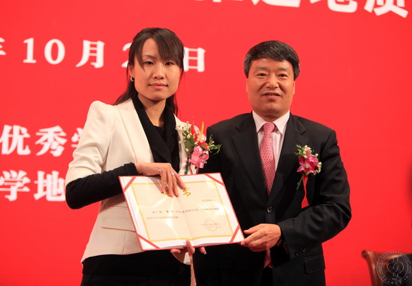 “第一次李四光优秀学生奖”共有11位学生分别获得“李四光优秀博士研究生奖”、“李四光优秀硕士研究生奖”及“李四光优秀大学生奖”,来自中国石油大学2007级地质工程专业的本科生杨茜获得了“李四光优秀大学生奖”。国土资源部部长、党组书记、李四光地质科技奖委员会主任徐绍史上台一一为11位获奖学生颁奖。