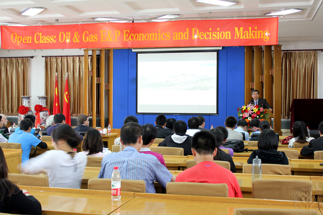 会议由新田中国有限公司总裁丁生先生主持。会上,张来斌致欢迎辞,表达了对来访客人的欢迎,并授予Lee K. Boothby及William D. Schneider中国石油大学兼职教授聘书。随后,Lee K. Boothby及William D. Schneider共同做了题为“Oil & Gas E&P Economics and Decision Making”精彩演讲。William D. Schneider详细介绍了新田石油公司的发展历程,而Lee K. Boothby则重点讲述新田石油公司的现状以及对未来的展望,其中还着重强调了天然气的发展在未来能源结构中的可能的重要地位,并为以新田公司的发展为鉴,为同学们也提供了成长需要注意的问题,并希望同学们可以有勇气尝试新的事物,取得成功。演讲之后,两位嘉宾还回答了同学们关于石油企业和自身发展的一些疑问。