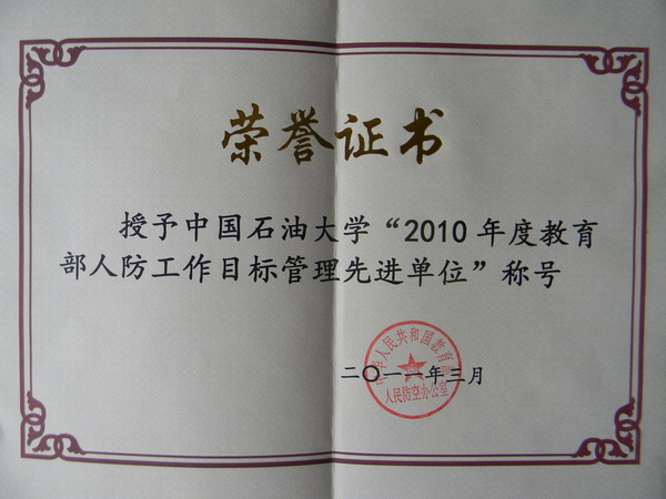 近日,教育部人民防空办公室对教育系统人防工作目标管理先进单位、先进工作者进行了表彰。中国石油大学与北京大学等8个在京部属高等学校、有关直属单位一起,获得“2010年度教育部人防工作目标管理先进单位”称号。