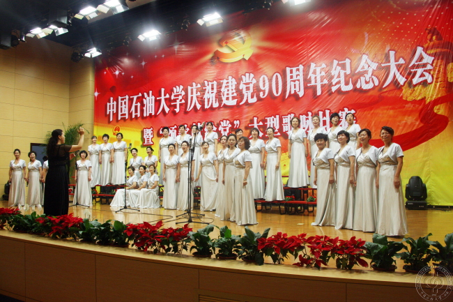 在隆重纪念中国共产党成立90周年之际,中国石油大学教职工“颂歌献给党”大型歌咏比赛在中油大厦三楼报告厅举行。全校共有18支代表队参赛,分成甲乙两组进行,校教工合唱团以及离退休工作处也应邀参加。一曲曲颂歌唱出了广大教职工对党的深情爱戴,嘹亮的歌声、精彩的演出展示了教职工内心的喜悦。最后,经过评委的打分,甲组:校机关获得一等奖,机械学院、理学院获得二等奖,信息学院、后勤服务总公司、石工学院获得三等奖;乙组:校办企业总公司获得一等奖,图书馆、体育教学部获得二等奖,人文学院、继续教育学院获得三等奖;获得优秀奖的是:地学院、外语系、化工学院、商学院、远程教育学院、提高采收率研究中心、校医院。离退休工作处、教工合唱团被授予表演奖。