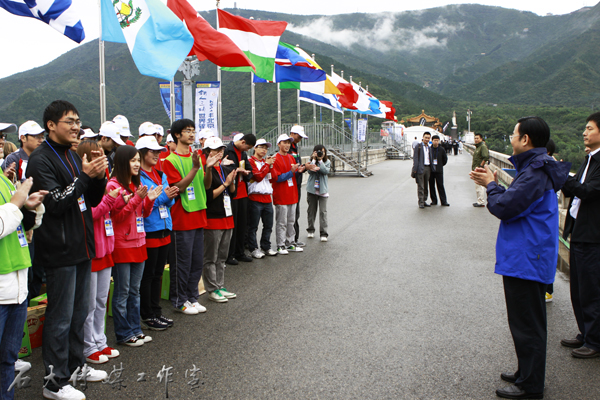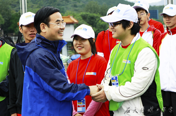 9月10日上午,校党委书记蒋庆哲冒着细雨来到2011北京铁人三项世锦赛的志愿服务工作现场,亲切慰问634名石大志愿者,带来了学校对志愿者的关怀和祝福。