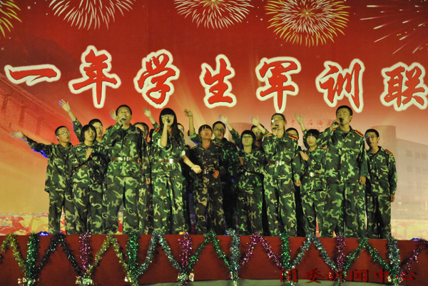 9月17日晚,中国石油大学2011级学生军训联欢晚会在红旗操场隆重举行,全体新生身着军装,齐聚一堂。学生工作处及院系负责人、96528部队教导队教官、各连队辅导员和全体受训学生一起观看了晚会。