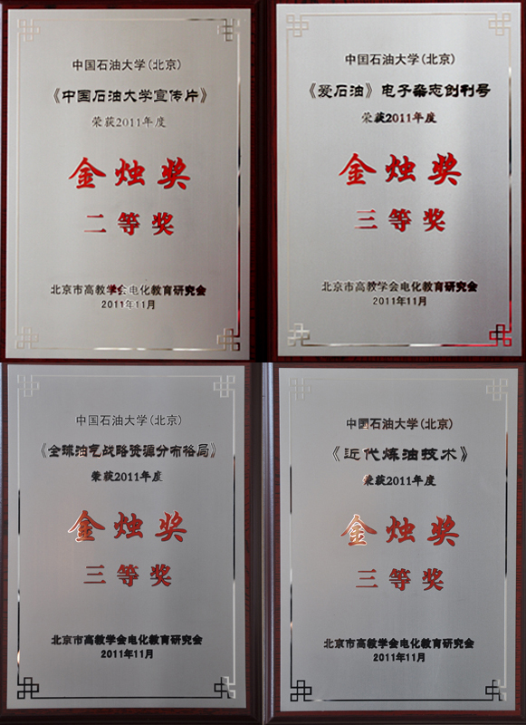 中国石油大学党委宣传部选送的《中国石油大学宣传片》获得二等奖,《爱石油》电子杂志创刊号获得三等奖;远程教育学院选送的两门网络课件《全球油气战略资源分布格局》和《近代炼油技术》获得三等奖。