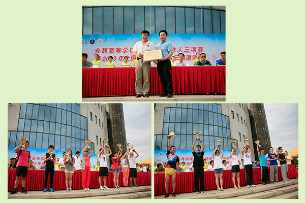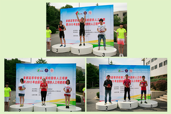 经过一天激烈的角逐,中国石油大学、北京林业大学、北京农学院荣获2013年全国高校校园铁人三项邀请赛团体总分前三名 ;中国地质大学(北京)、中国石油大学、北京林业大学荣获首都高等学校第二届校园铁人三项比赛团体总分前三名。
