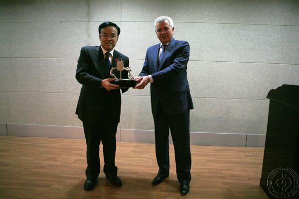 讲座最后,Vagit Alekperov在签名册上留言,并与张来斌互赠纪念品。