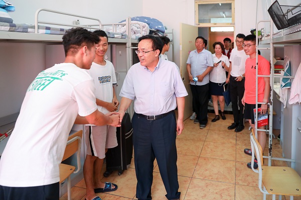 张来斌来到润杰学生公寓新生宿舍,与新生亲切交流,询问他们的家乡和报到手续办理等情况。当看到宿舍新生一报到就为准备英语分级考试努力学习,他微笑地鼓励大家:“看到你们认真学习的状态,考试肯定no problem!”安全与海洋工程学院本科新生苏宇阳身穿蓝色衣服,张来斌风趣地说:“从衣着开始,你已经提前进入角色,与海洋融为一体了。”苏宇阳表示会脚踏实地,学好专业知识,为石大增光添彩。张来斌看望了正在进行迎新工作的师生,嘱咐他们要做好新生各方面工作,全力为新生服务。