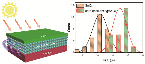 该研究成果首次提出了氧化锡包覆氧化锌核壳纳米结构的制备方法,揭示了其具有较高光电转换效率的内在机理。由于SnO2壳层的能级匹配和核层ZnO纳米粒子的高电子迁移率,无机钙钛矿太阳能电池的光电转换效率高达14.35%。ZnO@SnO2核-壳纳米粒子的尺寸为8.1nm,电子迁移率是SnO2纳米粒子的7倍。同时,均匀的核壳型ZnO@SnO2纳米粒子对无机钙钛矿薄膜的生长极为有利。这些结果表明,氧化锡包覆氧化锌核壳纳米结构是一种理想的太阳能电池的电子传输层光电转换效率比传统的电子传输材料提高40%