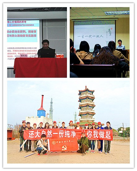 各学院广泛开展了“学理论、读经典”读书交流活动、“我眼中的传统文化”大学生讲坛、“向上向善”身边的榜样评选等活动。地球物理与信息工程学院、外国语学院的读书交流活动激发了同学们对“中国梦”的信心与力量。地球科学学院、理学院承办的大学生讲坛,通过中华优秀传统文化的讲述,引导同学们感悟传统文化的底蕴和魅力,增强了同学们的文化自信和价值观自信。此外,为深入挖掘石大学生道德实践先进事迹,发现校园内的道德实践榜样,以榜样的力量激励学生积极投身道德实践,学校组织开了“向上向善“评选活动,通过文字、图片、视频等形式在大学生在线和校园网展示石大学生的道德先进事迹,进一步营造网上良好氛围。