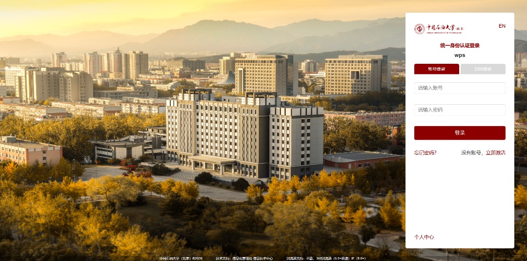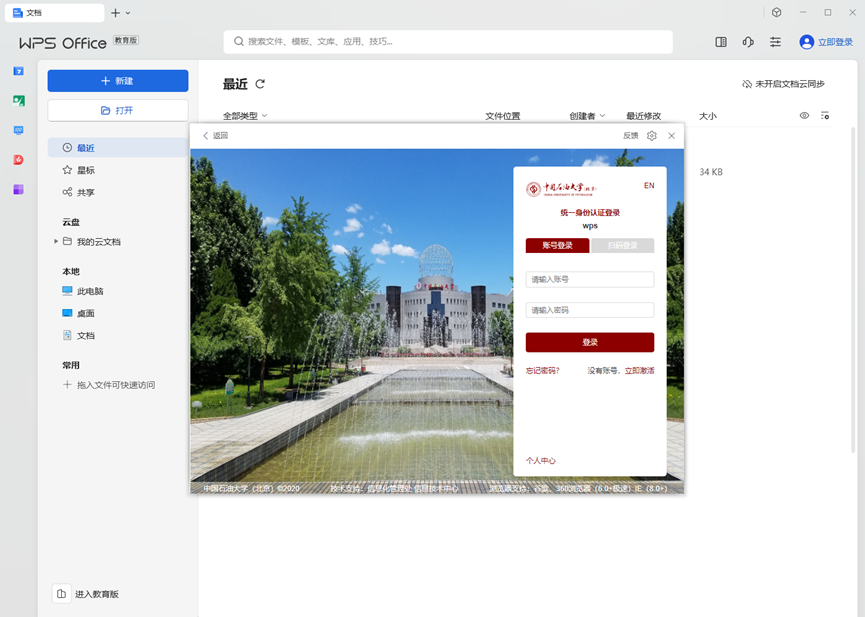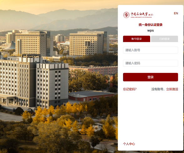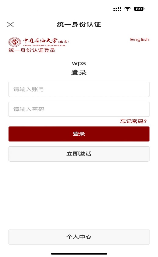 (2)无客户端访问地址:https://wps.cup.edu.cn,可直接通过输入统一身份认证账号和密码进行激活和登录使用。